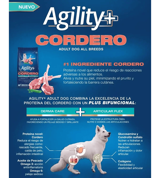 Combina la excelencia de la proteína del cordero, con nutrientes específicamente integrados para potenciar su salud, con un plus bifuncional: contribuye a la disminución de los síntomas relacionados con intolerancia alimentaria + protección del aparato osteoarticular.