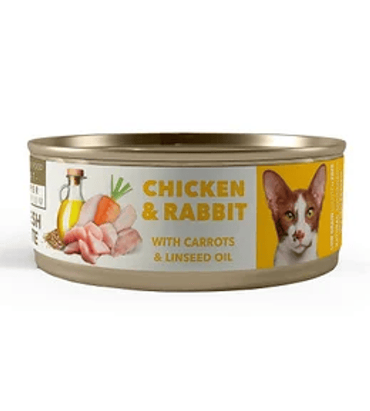 Pollo 20%, hígado de pollo 12%, conejo 5%, zanahoria 4%, arroz, aceite de linaza 0,5, minerales.