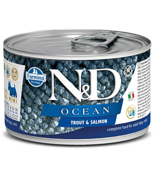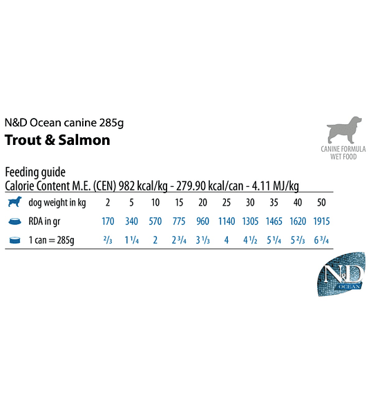 Trucha (25%), filete de salmón (20%), filete de bacalao, arenques, batata, gambas, aceite de pescado, fructooligosacáridos, cloruro de colina, sulfato de condroitina, glucosamina, vitaminas, minerales.