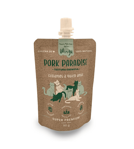 Pouch para gatos de cerdo con textura suave y untable, ideal para consumo directo de la boquilla.